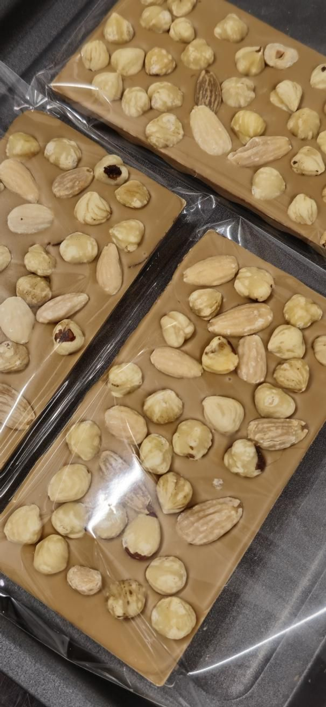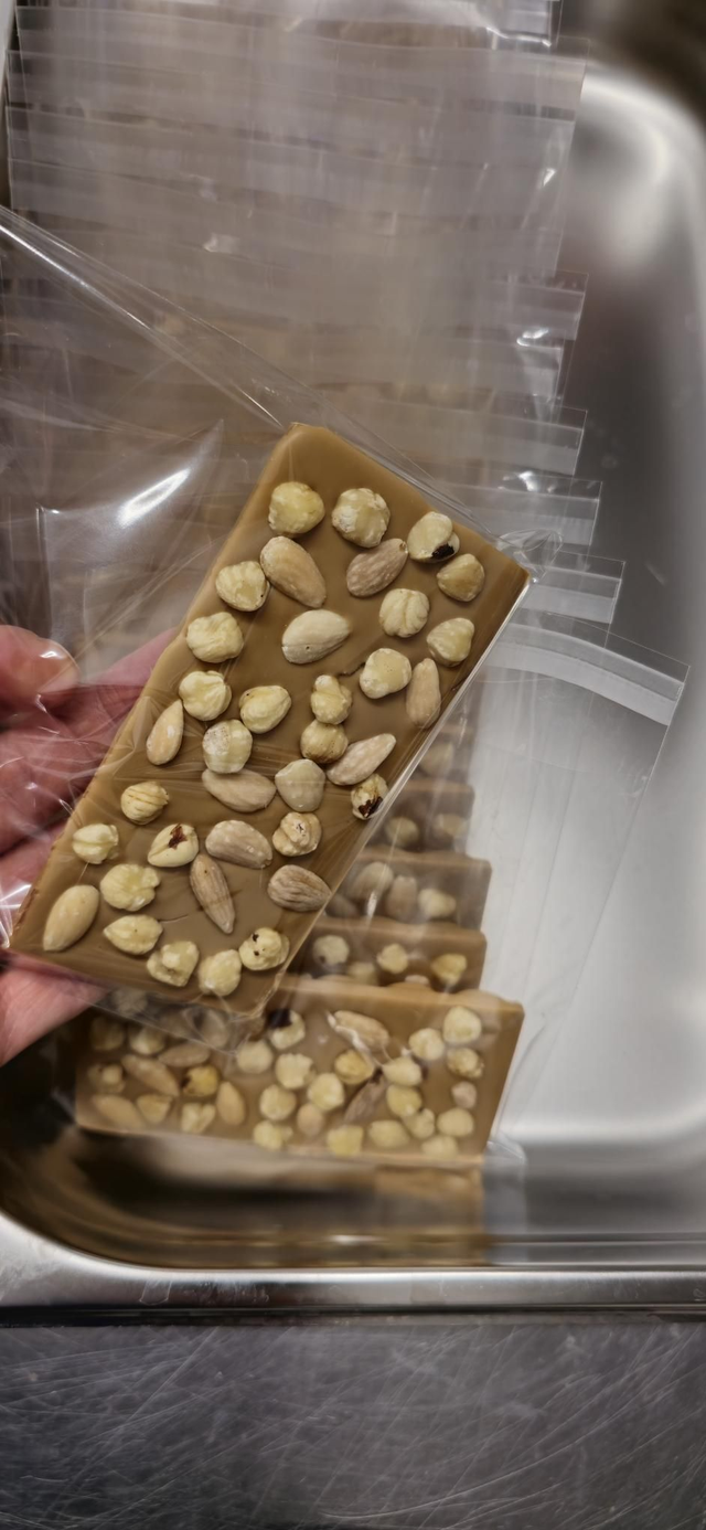 Caramel chocolate bar with hazelnut.