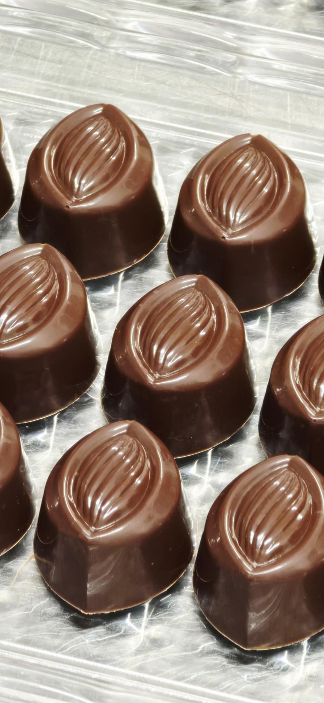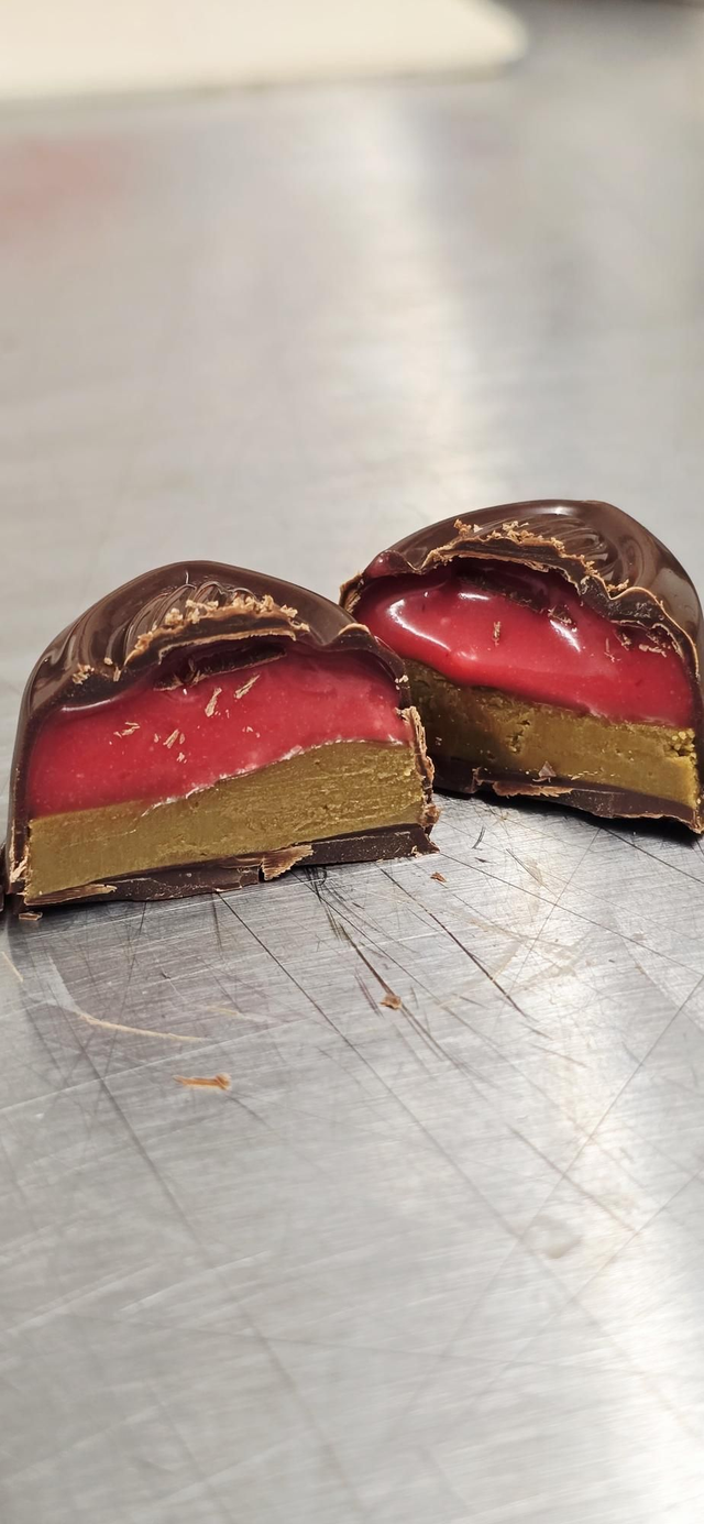 Dark chocolate bonbon with Raspberry puree and pistachio paste.