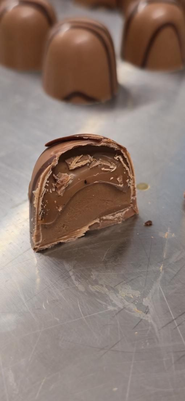 Milk chocolate bonbon with coffee ganache and Pecan praline.